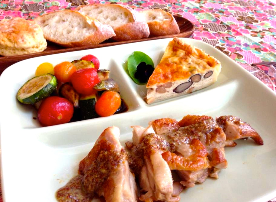 トマトとズッキーニのマリネ、お豆のキッシュ、スコーン、バケット