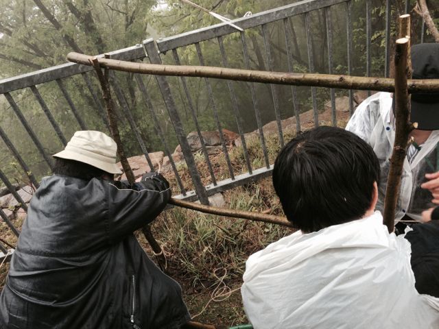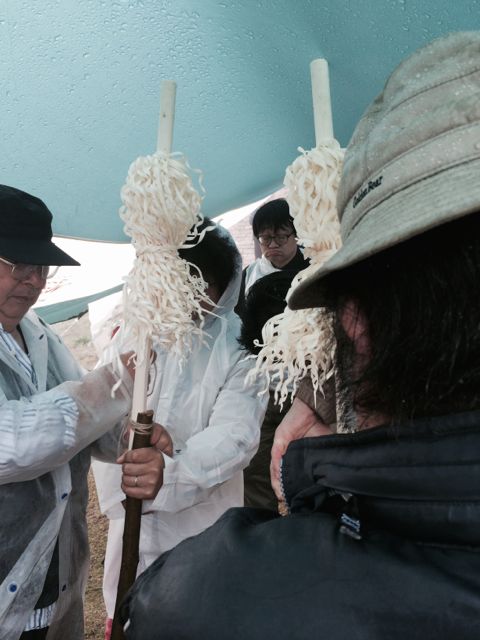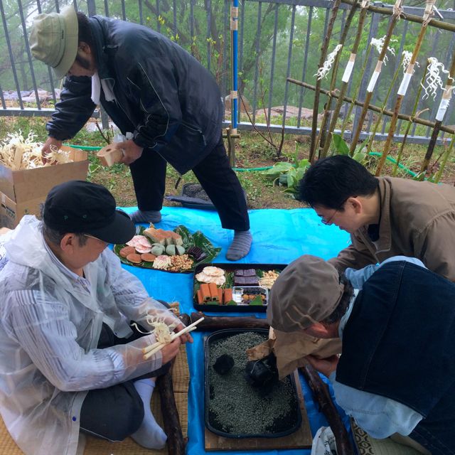 男性陣は雨の中木の枝を組み、イナウを並べるヌササン(祭 壇)を作っています。