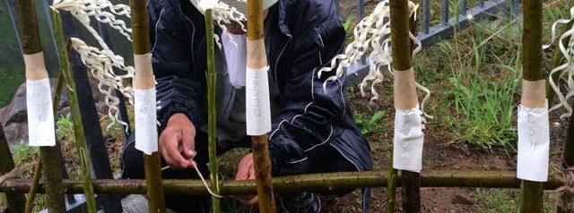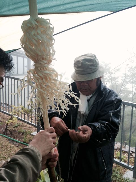 柳の気を削り房にしたもの、ここまではポンペさん達が作ってくれていたもので、これに木の枝を括り付けていきます。
