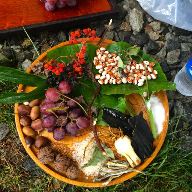 持ち寄った神様に捧げる食べ物を笹の葉の上に並べます。