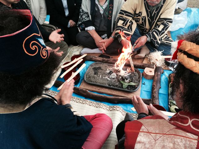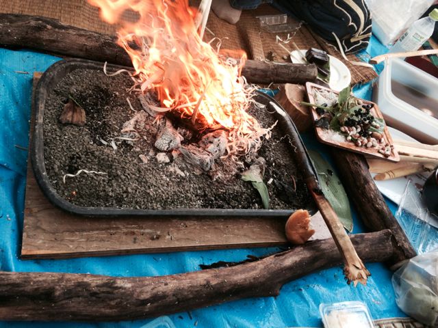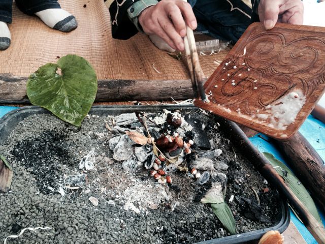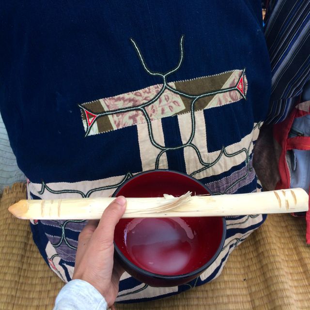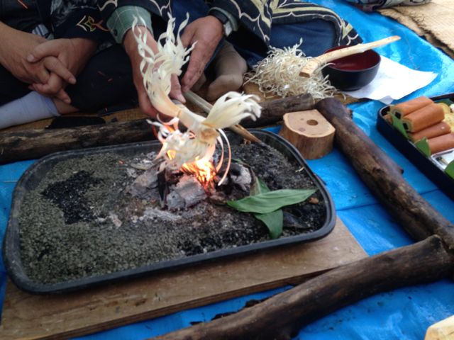 手作りのイクパスイで炎(火の神様)にお酒を捧げているところ。