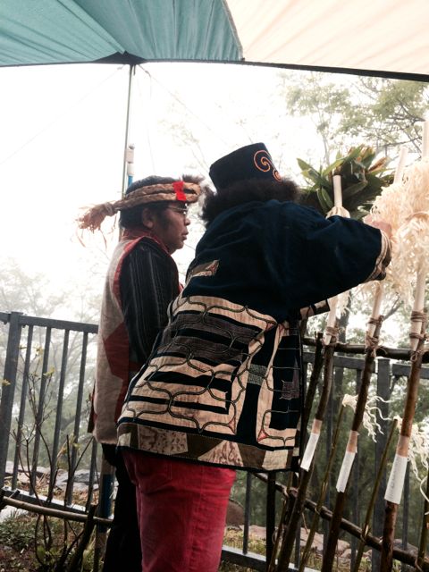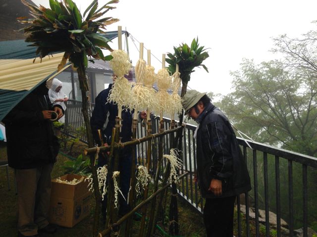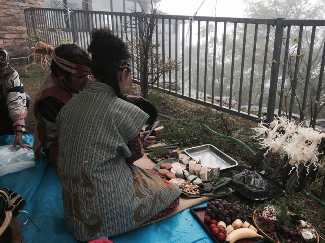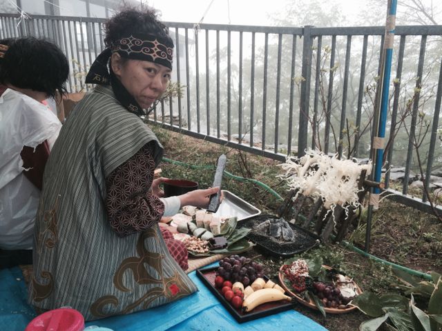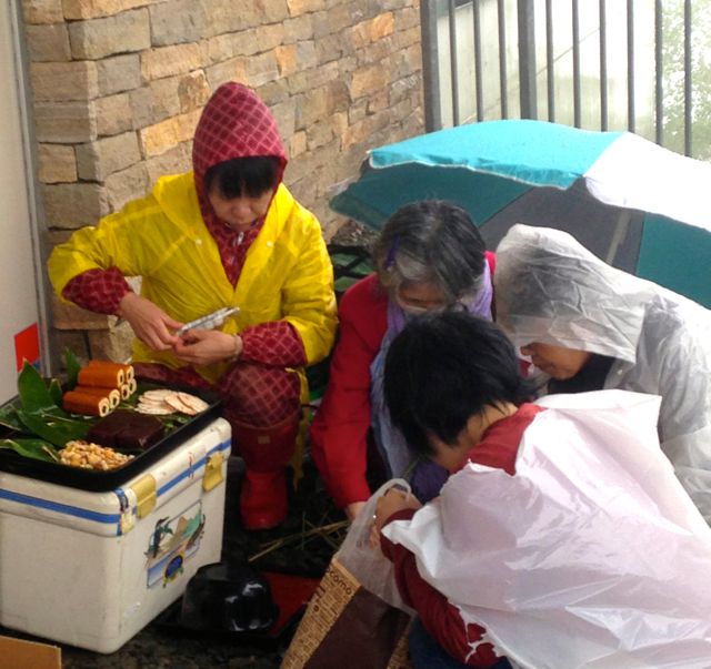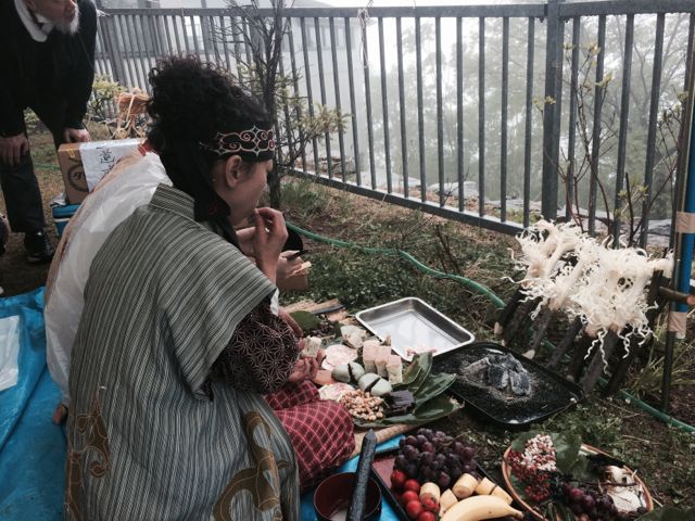 土砂降りの中、火をおこし、捧げ物を並べます。