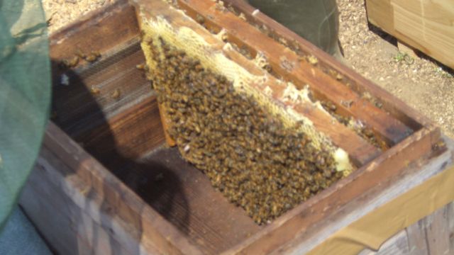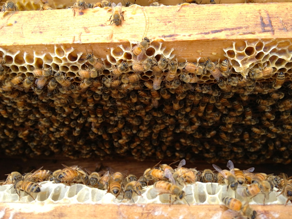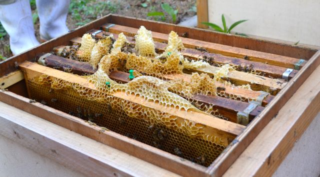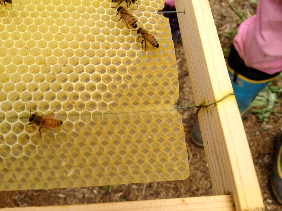 蜂ろうを使った新しい巣居たの建設にとりかかりだす。