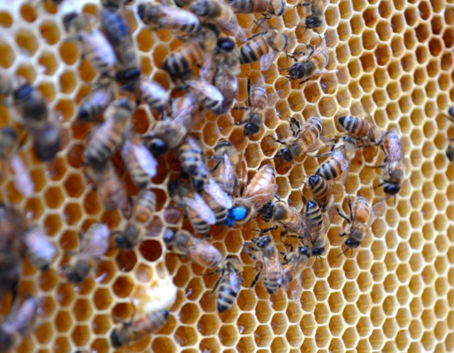 蜂蜜を入れた巣房に蜂ろうで封をして、また巣の入口に戻り、次の荷を受け取って来る。