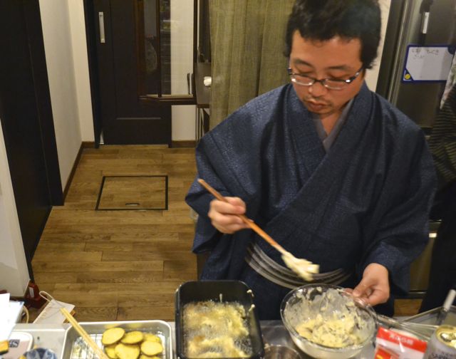 きのこ屋大将も天ぷらをあげたり