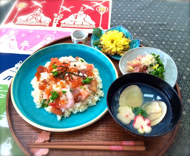 ヘンプナッツいり酢飯(今回は玄米ではなく五分付きの無農薬米にしました)にお刺身をヘンプオイルと醤油でづけにしたものをちらした大麻ばら寿司