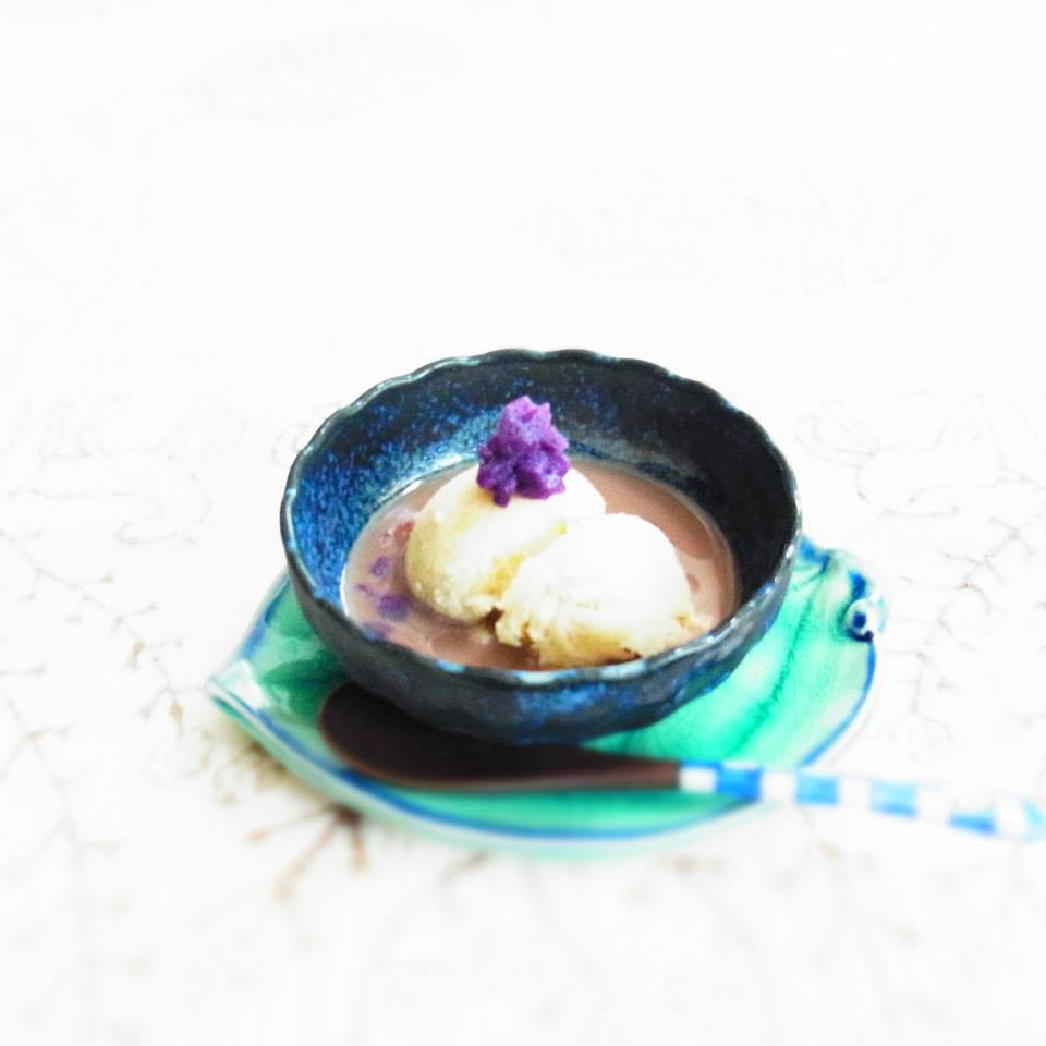 豆乳ぜんざいの上に甘酒アイス、紫芋の寒天寄せをアクセントにしてみました。